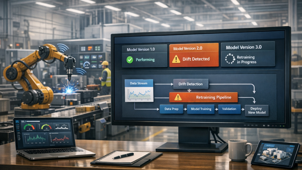 Practical guide for manufacturers and enterprises on lifecycle governance for digital twins: how to detect model drift, set retraining rules, and operationalize validation and deployments.